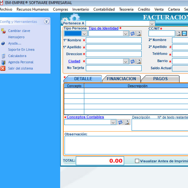Poseemos una línea de software estandarizado, denominado EM-EMPIRE; el cual contiene los módulos de todas las áreas de una empresa (Recursos Humanos, Contabilidad, Tesorería, Ventas, Compras, Cartera, Servicio al cliente, Inventario o almacén, entre otros).